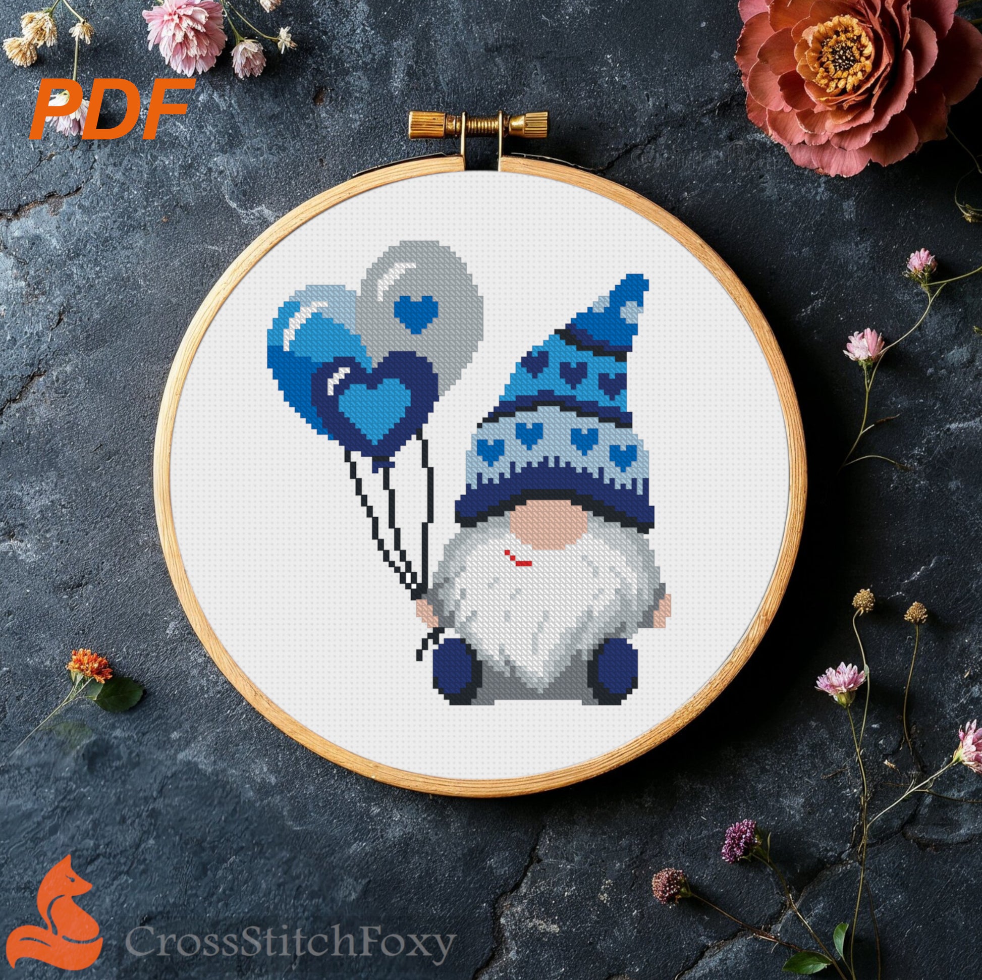 Valentine Gnome with balloons cross stitch pattern PDF